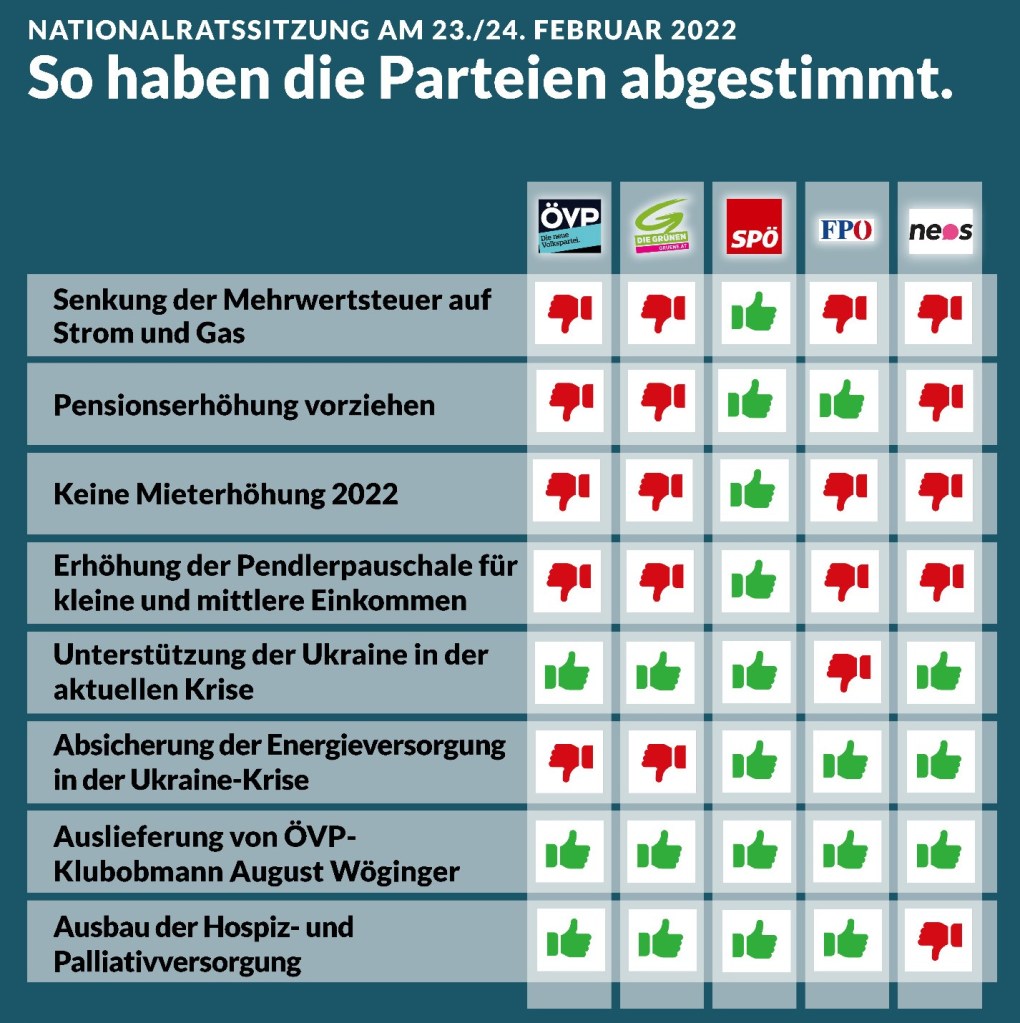 Ich möchte euch gerne mit den Ergebnissen der Abstimmungen der Nationalratssitzung am 23. und 24. Februar 2022 ins Wochenende schicken.