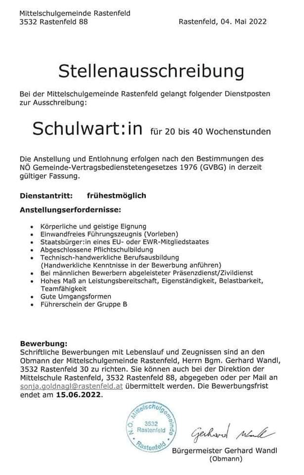 Stellenausschreibung Verfasst vonchristianvolek6. Mai 202219. Mai 2022Veröffentlicht inAllgemeinSchlagwörter:Schulwart, Stellenausschreibung, Waldviertel Ich hoffe ja doch nicht, aber wenn jemand Interesse hat ins Waldviertel zu übersiedeln … Teilen mit: Klicke, um auf X zu teilen (Wird in neuem Fenster geöffnet) X Klick, um auf Facebook zu teilen (Wird in neuem Fenster geöffnet) Facebook Gefällt mir Wird geladen … Ähnliche Beiträge