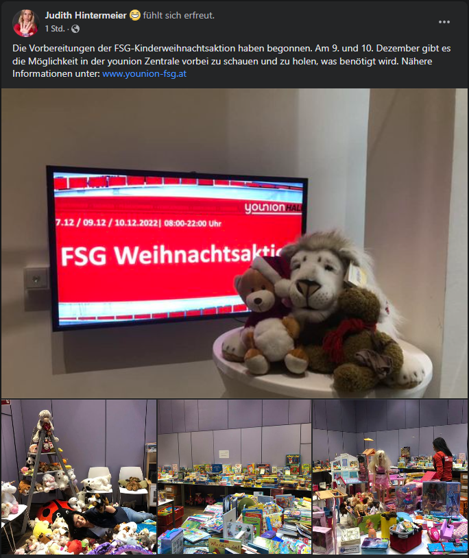 Die FSG-Kinderweihnachtsaktion bietet allen Familien, die es aufgrund der schwierigen Bedingungen zurzeit nicht leicht haben, die Möglichkeit gespendete Weihnachtsgeschenke gratis zu bekommen. Unter dem Motto „vorbeischauen und holen was benötigt wird“ lade ich euch ein diesen Termin wahrzunehmen. Gebt der younion Frauenabteilung die Möglichkeit euch zu helfen.