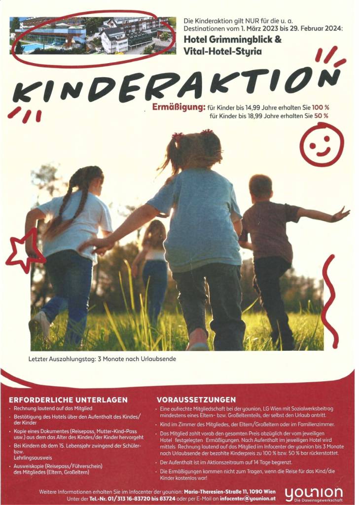 Wie wäre es mit einem unserer beiden Hotels in der schönen Steiermark und dabei kann auch noch doppelt gespart werden. Die younion Kinderaktion gilt NUR für die beiden unten angeführten Destinationen,