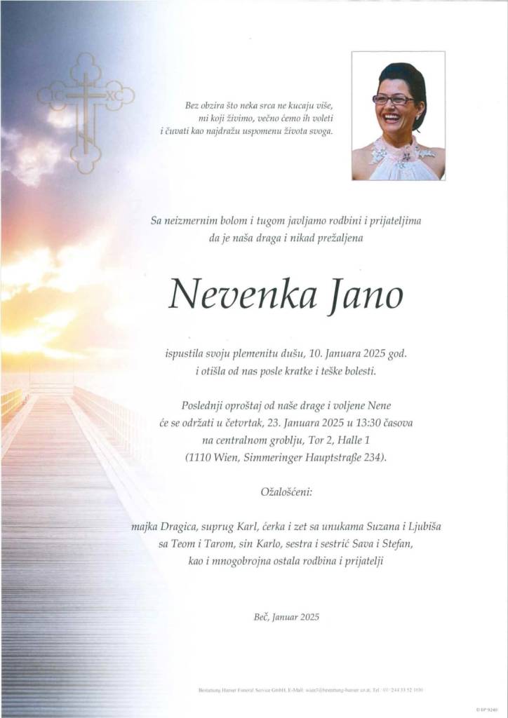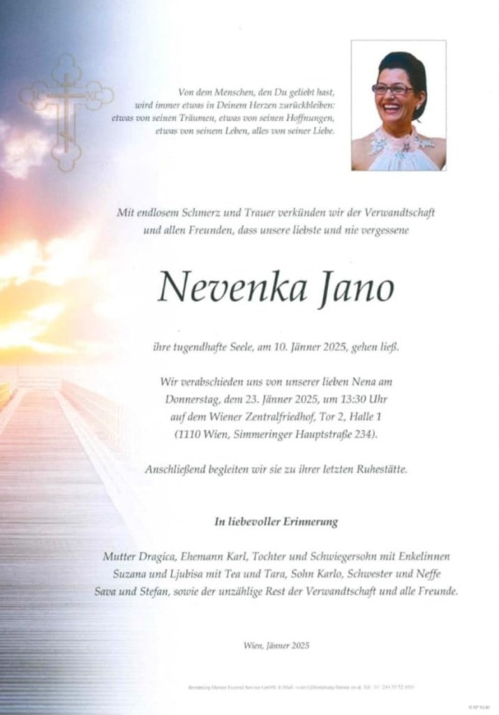 Die Beerdigung von Jano Nevenka findet am 23.01.2025 Zentral Friedhof Tor 2 Halle 1 um 13:30 statt.