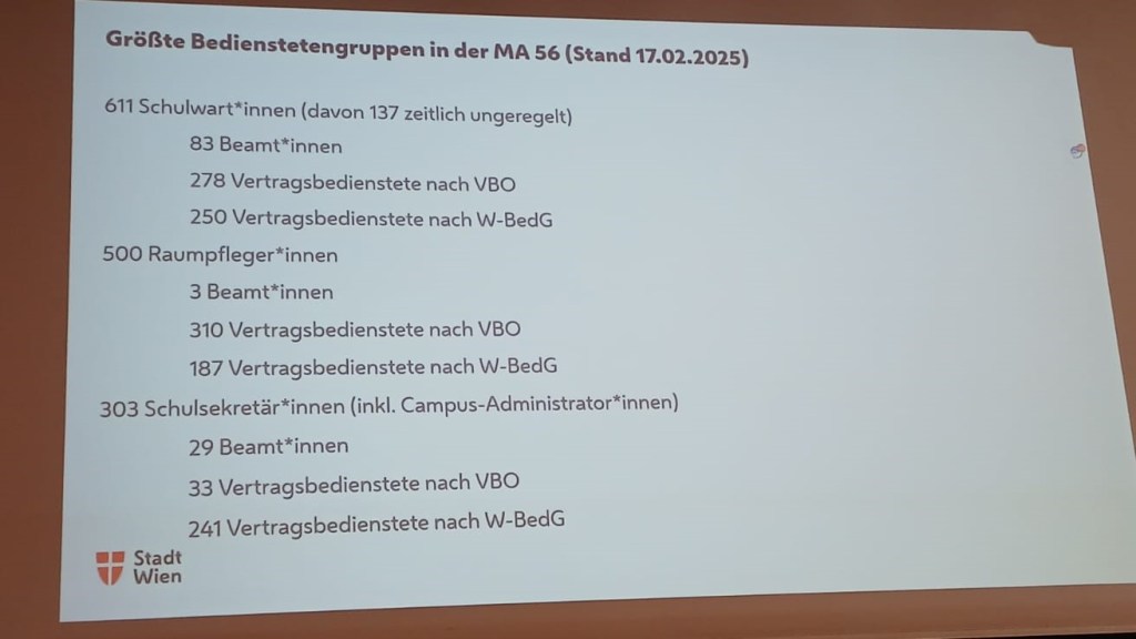 Die Abteilungsleiterin teilte auch mit, dass sie die Vorteile von zeitlich ungeregelten Schulwart*innen sehr schätze allerdings schaffen diese auch die meisten Probleme, obwohl es nur mehr 137 davon gibt.