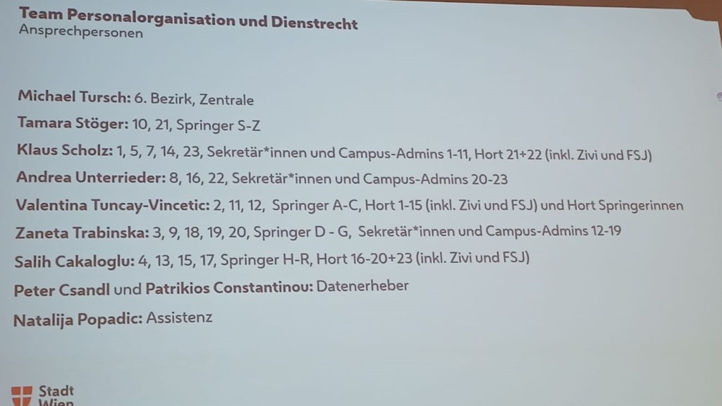 Gestern fand in der Berufsschule Längenfeldgasse die Infoveranstaltung des Fachbereichs Personal statt. Die Folien mit den Infos sollten in den nächsten Tagen an alle Kolleg*innen geschickt werden.